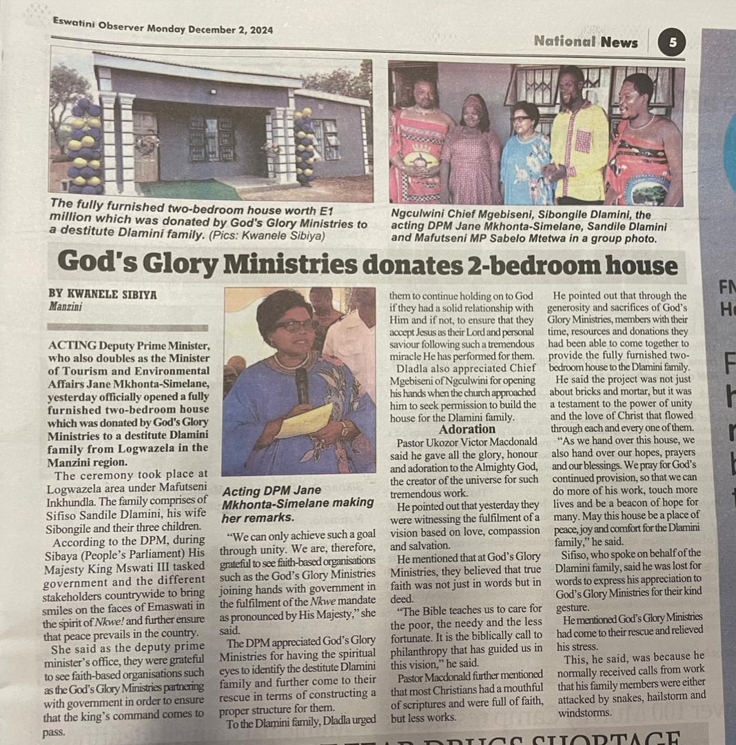 God’s Glory Ministries under Pastor Victor Ukozor Macdonald builds two bedroom house for destitute Dlamini family, Deputy Prime Minister(DPM) graces official handover. BY BONGIWE DLAMINI