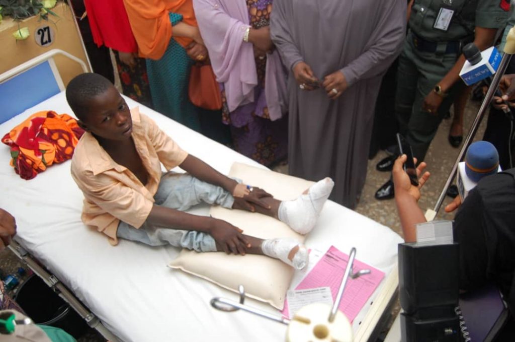 The first lady of Gombe State, Hajiya Asma’u Muhammadu Inuwa Yahaya, paid visit to the 14 year old boy tortured by a bakery operator in Bajoga, Funakaye Local Government area of the state, for allegedly stealing bread.