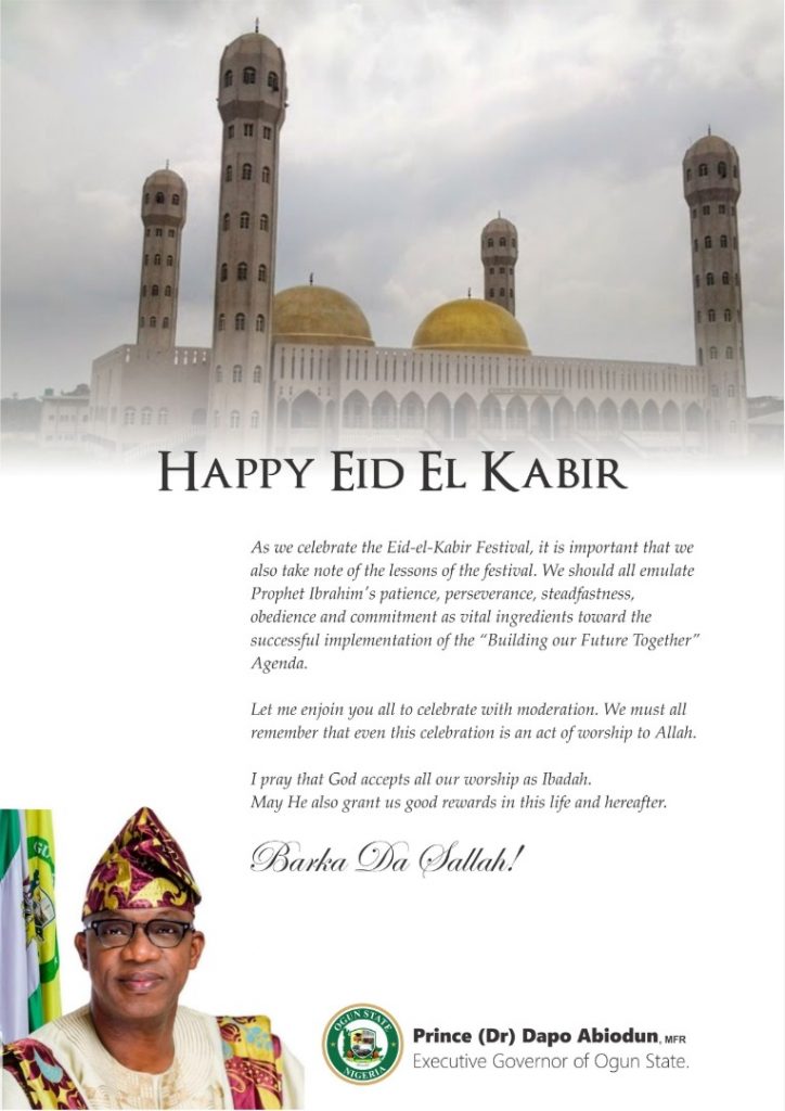 GOODWILL MESSAGE BY THE GOVERNOR OF OGUN STATE, HIS EXCELLENCY, PRINCE DAPO ABIODUN, MFR ON THE 2019 EID-EL-KABIR FESTIVAL, HELD ON SUNDAY, 11TH AUGUST, 2019