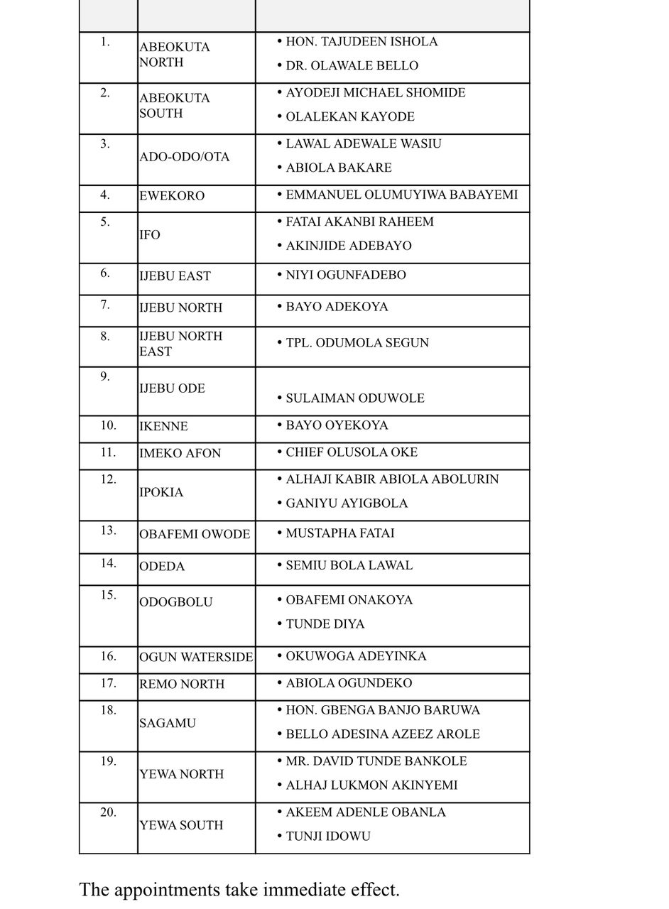 A statement issued in Abeokuta on Monday by the Governor’s Chief Press Secretary, Mr Kunle Somorin, said the appointments are made in furtherance of the Administration’s inclusive approach to governance, boosting the Building Our Future Together Agenda and deepening democracy.