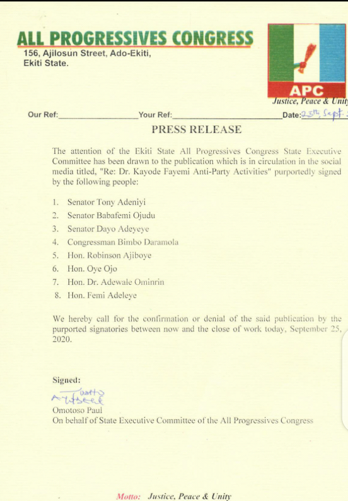 While one would have dismissed their claims as another failed attempt to polarise the party in the state, it is also important to put it on record that the action of the group smacks of criminal impersonation as none of those who signed the purported suspension letter were executive members of the party at ward, Local government or state level.