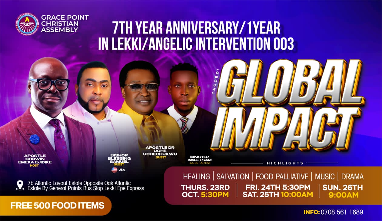 Grace Point Assembly has announced plans for a four-day celebration tagged “GLOBAL IMPACT” to mark the church’s 7th anniversary and first year in Lekki.