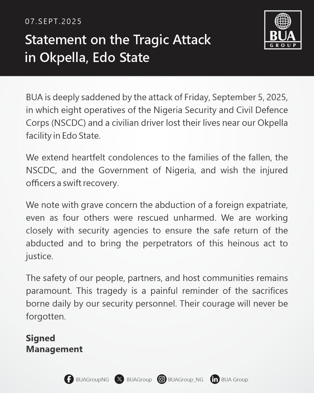 Okpella, Edo State — BUA Group has expressed deep sadness over the tragic attack that occurred on Friday, September 5, 2025, near its Okpella facility in Edo State, which led to the death of eight operatives of the Nigeria Security and Civil Defence Corps (NSCDC) and a civilian driver.