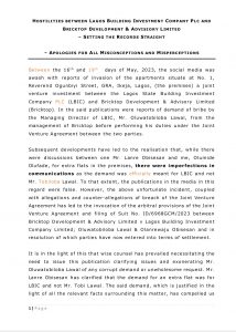 HOSTILITIES BETWEEN LAGOS BUILDING INVESTMENT COMPANY PLC AND BRICKTOP DEVELOPMENT & Advisory LIMITED – SETTING THE RECORDS STRAIGHT –