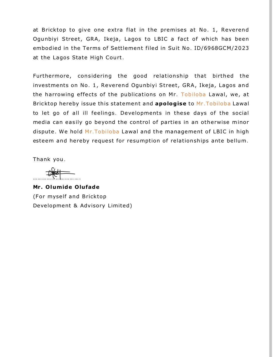Furthermore, considering the good relationship that birthed the investments on No. 1, Reverend Ogunbiyi Street, GRA, Ikeja, Lagos and the harrowing effects of the publications on Mr. Tobiloba Lawal, we, at Bricktop hereby issue this statement and apologise to Mr.Tobiloba Lawal to let go of all ill feelings.