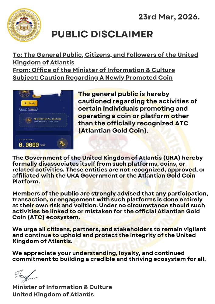 23rd March, 2026 – The Office of the Minister of Information & Culture of the United Kingdom of Atlantis (UKA) has issued an official public disclaimer cautioning citizens, followers, and the general public about the activities of individuals promoting and operating a coin or platform that is *not* the officially recognized Atlantian Gold Coin (ATC).