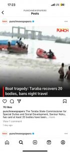 Also, The Taraba State Commissioner for Special Duties and Social Development, Saviour Noku, announced that at least 20 bodies have been recovered from the boat accident that occurred along the Mayo-Renewo-Karim Lamido Waterway in River Benue.