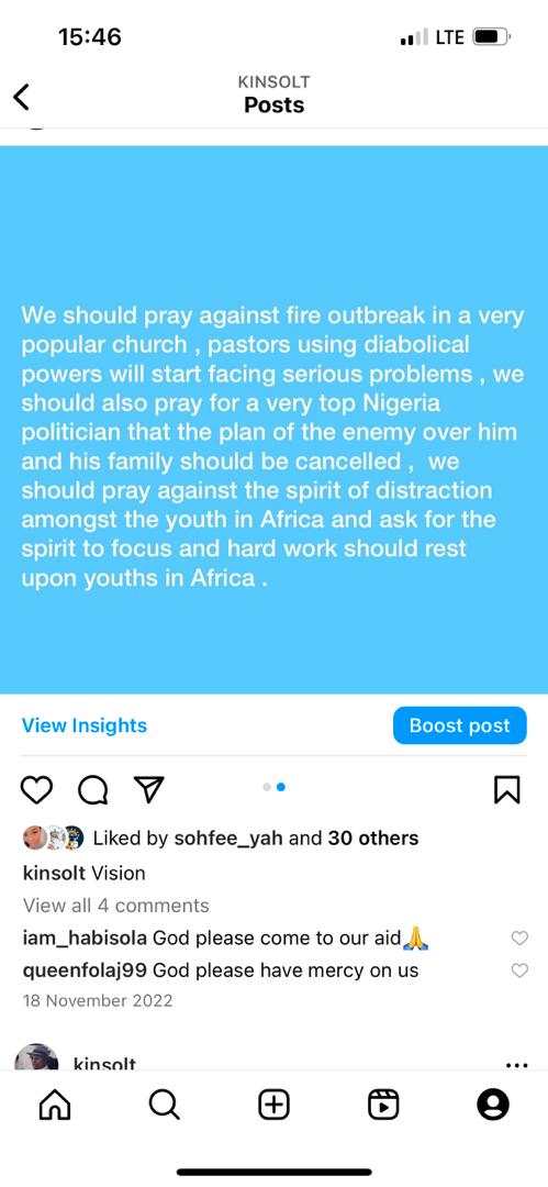 On November 18th, 2022, prophet Kingsley gave a prophetic warning that they should pray against fire outbreak in the church.