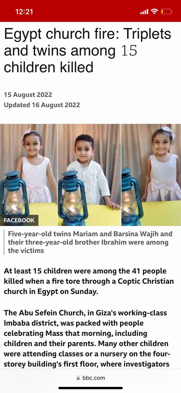 Few days later, a report came out of how fire tore through a coptic church in Egypt which led to the loss of lives including 15 children. The report says; “At least 15 children were among the 41 people killed when a fire tore through a Coptic Christian church in Egypt on Sunday.