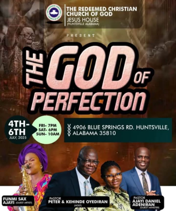A 3-day powerful spiritual gathering tagged ‘God of Perfection’ will be hosted by Pastor Peter and Kehinde Oyediran, shepherds-in-charge of RCCG Jesus House Huntsville, Alabama, USA, from Friday, July 4 to Sunday, July 6, 2025, at 4906 Blue Springs Road, Jesus House Huntsville, Alabama 35810