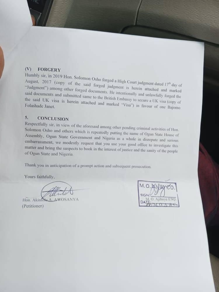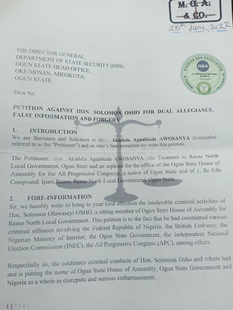 As concerned youths of Remo North Local Government, we wish to notify legislative arm of our state government and the general public that we have submitted a petition detailing the unlawful activities of Hon. Solomon Osho who currently represents us at the State House of Assembly.