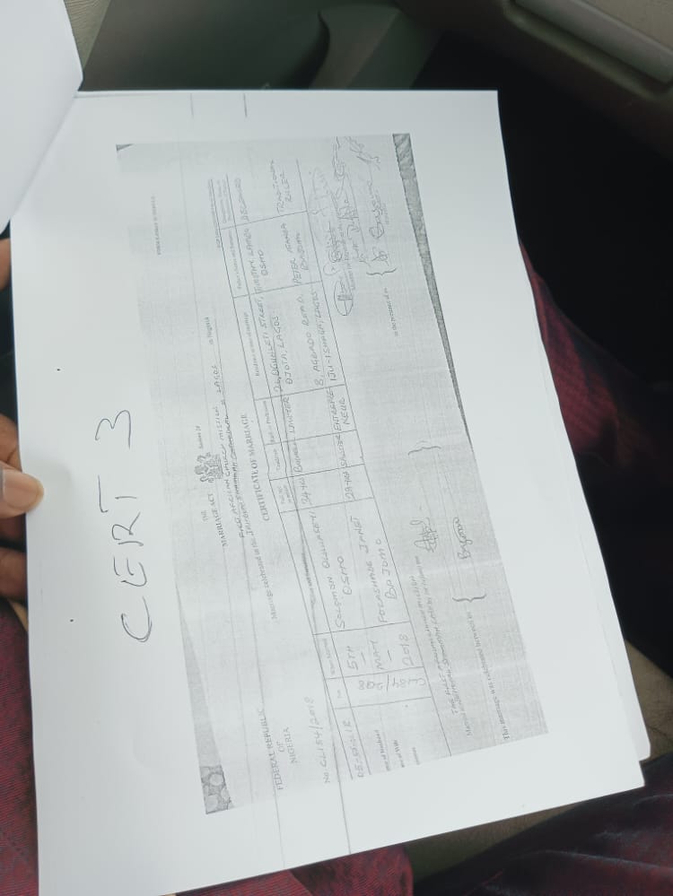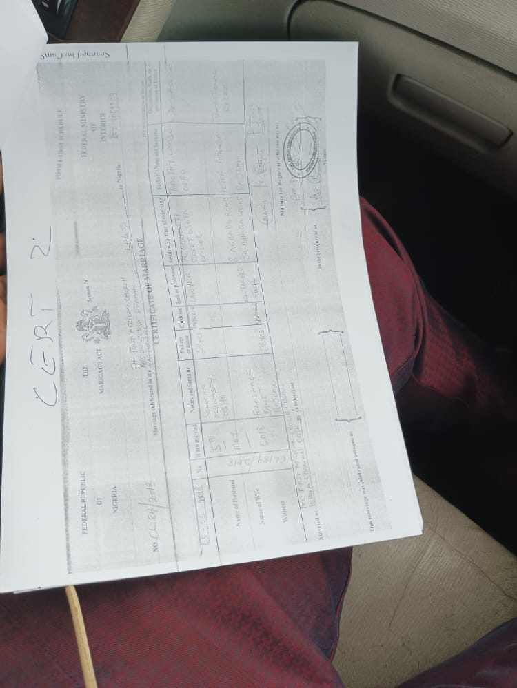 In 2016, he hoodwinked the Ministry of Interior by providing false information while getting to Mayowa Anthonia Taiwo in Alimosho Local Government of Lagos State with marriage certificate number AL01201.