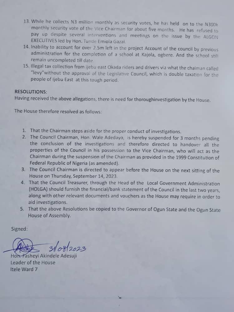 2. The Council Chairman, Hon. Wale Adedayo, is hereby suspended for three months pending the conclusion of the investigations and therefore directed to handover all the properties of the Council in his possession to the Vice Chairman, who will act as the Chairman during the suspension of the Chairman as provided in the 1999 Constitution of Federal Republic of Nigeria (as amended).