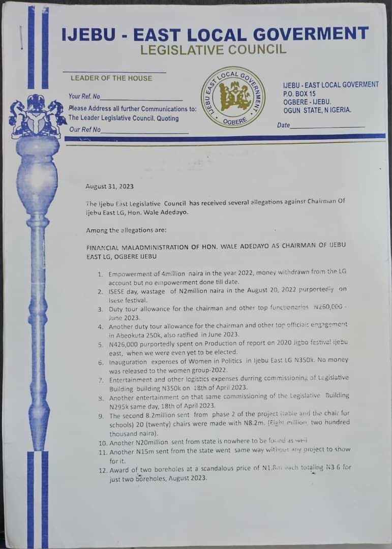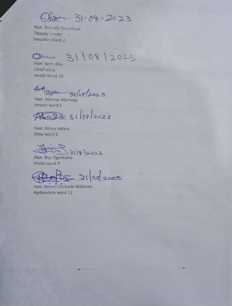Seven Councilors, on Thursday said the Legislative Council received various allegations that need to be investigated and directed Mr. Adedayo to appear at its next sitting on Thursday, September 14, 2023.