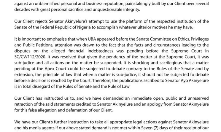 We write on behalf of Mr Tony Elumelu CON (Our client) whose attention has been drawn to several false online publications credited to Senator Ayo Akinyelure, chairman of the senate committee on ethics, privileges and public relations alleging to the involvement of UBA and indictment of Mr Elumelu In a 41,000,000,000 (Fourty-one billion) fraud relating to NITEL in liquidation.