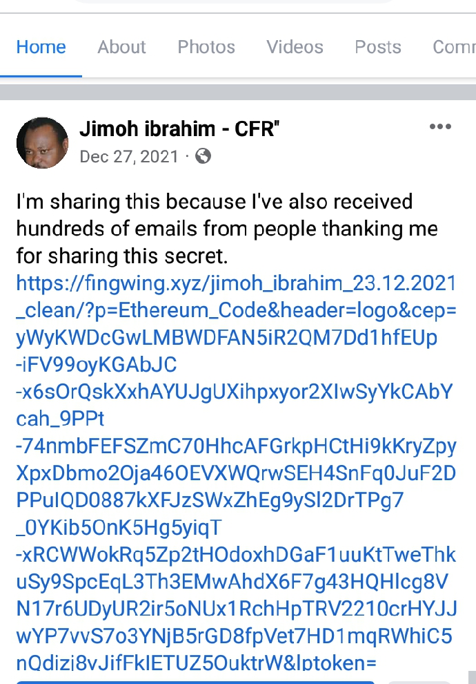 The page advertised a phony link which projected an investment profile with a fake note credited to Jimoh Ibrahim written thus: ” I am sharing this because I ‘ve also received hundreds of emails from people thanking me for sharing this secret. ” The scam link is ‘https://fingering. xyz/Jimoh Ibrahim_23.122021′