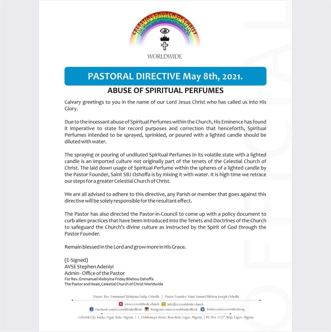 “The spraying or pouring of undiluted Spiritual Perfumes In its volatile state with a lighted candle is an imported culture not originally part of the tenets of the Celestial Church of Christ. The laid down usage of Spiritual Perfume within the spheres of a lighted candle by the Pastor Founder, Saint SBJ Oshoffa is by mixing it with water. It is high time we retrace our steps for a greater Celestial Church of Christ.