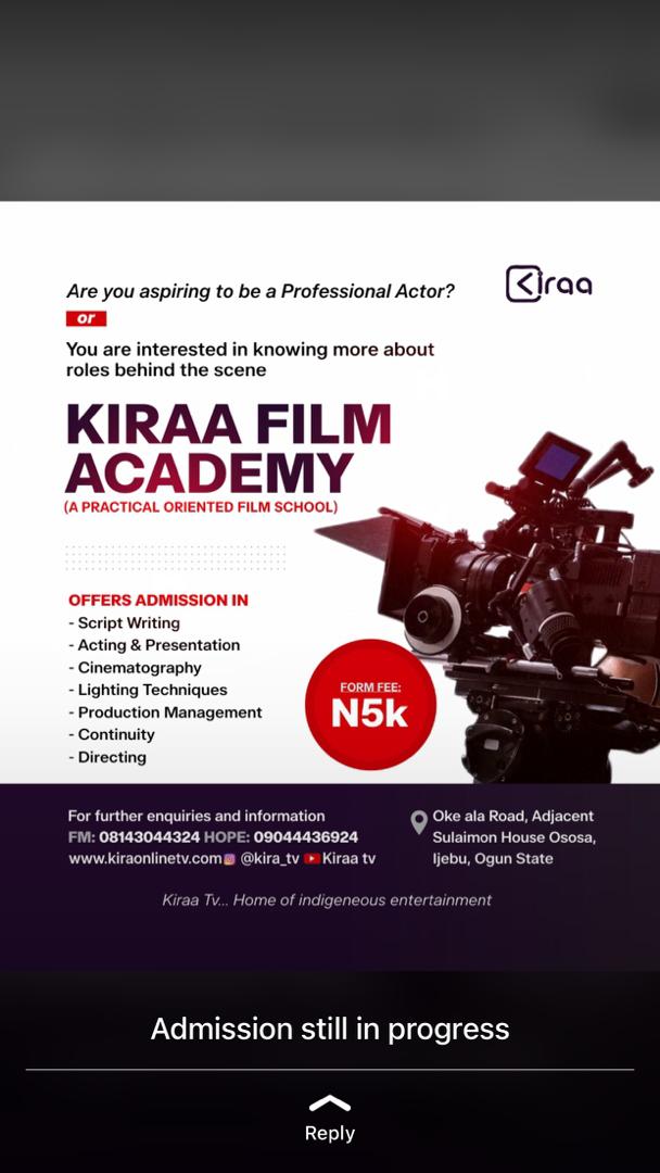 The Kiraa Film Academy offers admission in scriptwriting, acting and presentation, cinematography, lighting techniques, production management, continuity, and directing. Aspiring individuals can secure admission by obtaining an admission form for the sum of ₦5,000, at Oke Ola road, adjacent Sualimon House, Ososa Ijebu, Ogun State.