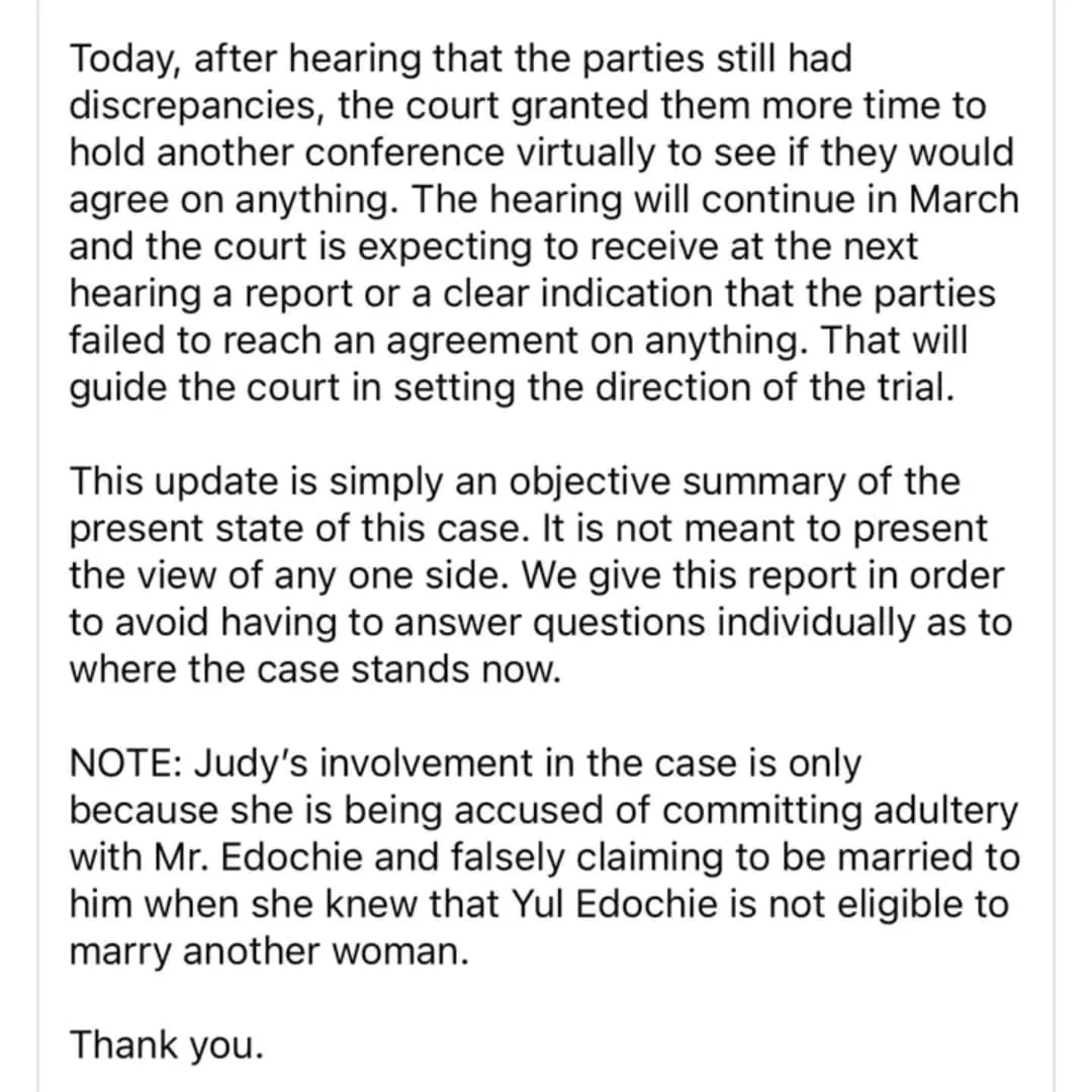 DPA UPDATE ON THE DIVORCE CASE OF MARY YUL-EDOCHIE V. YUL EDOCHIE AND UCHECHUKWU JUDITH MUOGHALU (JUDY AUSTIN)