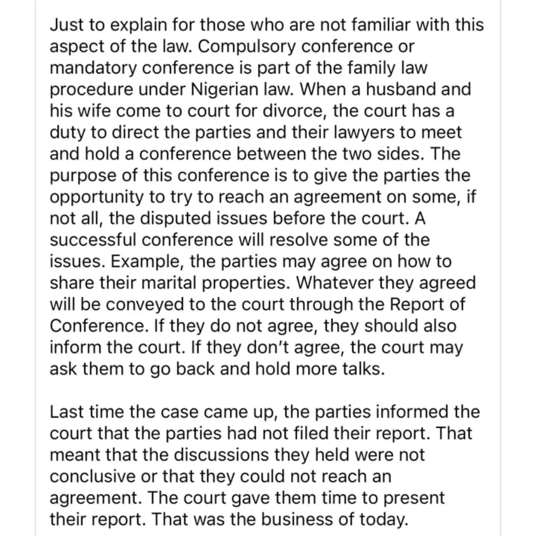 In a dramatic legal development, the court held a compulsory conference as mandated by Nigerian family law. This legal process requires both parties to engage in discussions, along with their lawyers, in an attempt to resolve at least some of the contested issues before the court.