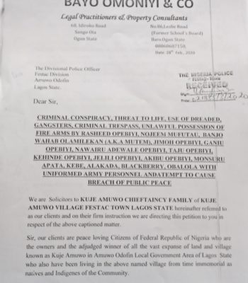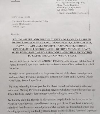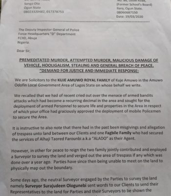 Determined to get justice for those killed, Counsel to the Kuje Amuwo family, Bayo Omoniyi in a petition to the Inspector General of Police, IGP Ibrahim Mohammed, dated March 19, 2020 demanded an investigation to be carried out to know why there was no response from the Police in spite of previous report on the attack.