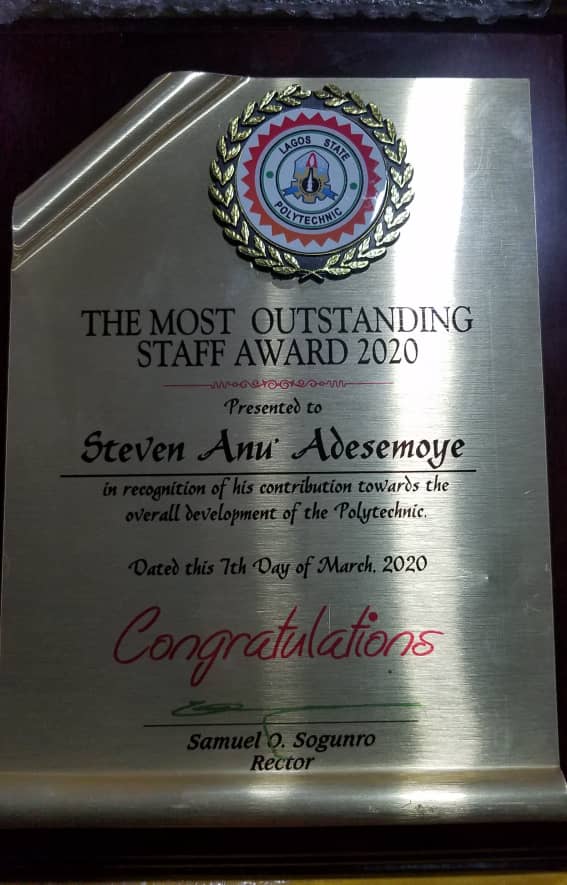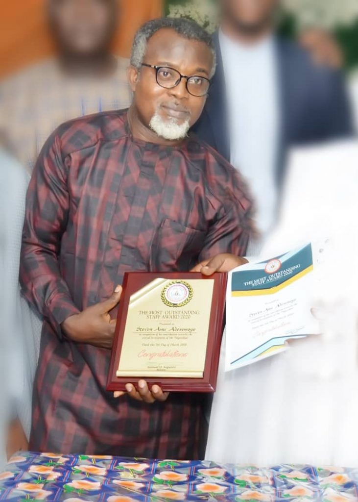 There are two categories of awards which are; Productivity and Excellence. Mr. Steven Adesemoye of the Mass Communications Department was awarded the overall best as the Most Outstanding Staff of the year. The award reads for his contributions towards the overall development of the Polytechnic.