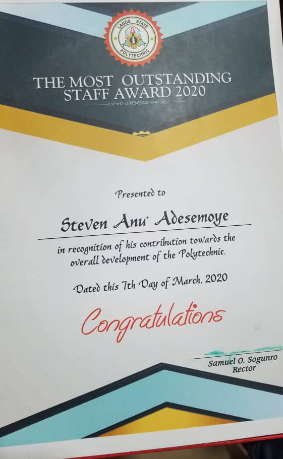 He explained further “Though, this is not my first. In 2005, I was awarded Best Staff (Technical) under the directorship of Mr Olawumi Anthony Gasper. But this very one is the biggest and somehow remarkable.” Concluded an elated Adesemoye.