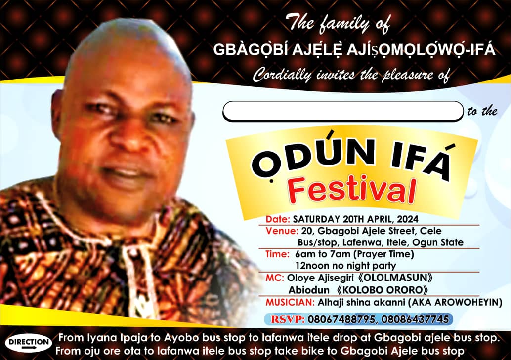 Legendary Ifa worshipper and icon, Gbagobi Ajele Ajisomolowo- Ifa is set to hold an annual Ifa Festival. Ifa is a deity oracle and one of the Yoruba most important deities.