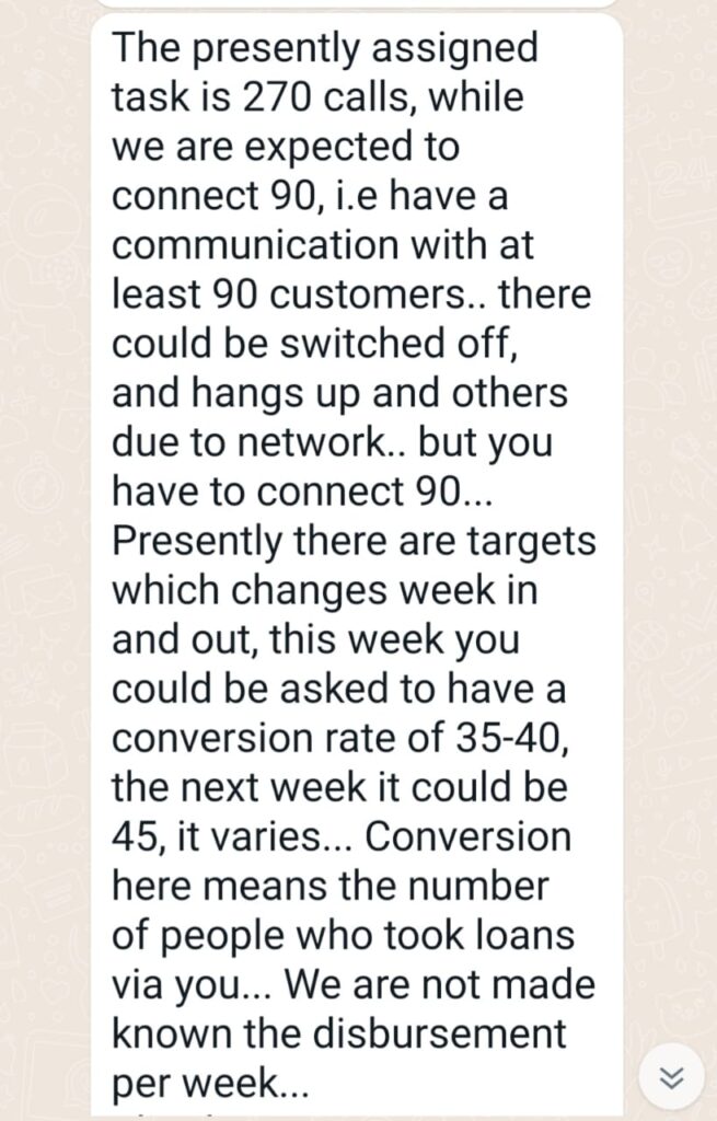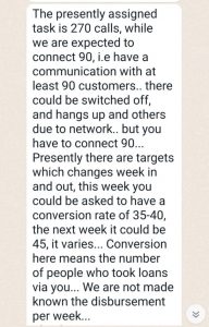 Each day, we are assigned 270 numbers to call and we are expected to connect at least 90, that is, have communication with at least 90 customers. Some of the numbers could be switched off, and there could be hang-ups due to poor network, but you have to connect 90. The worse is the conversion rate target is not static, this week you could be asked to have a conversion rate of 35-40, and the next week it could be 45. Conversion here means the number of people who took loans through you,” one of the agents told Nairametrics.