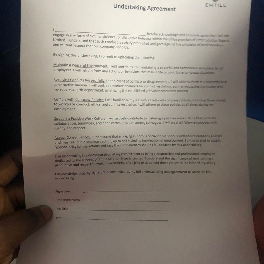 According to them, the management of the company handling the loan apps, Emtill Solutions Limited got wind of the plan and hurriedly issued an undertaking to be signed by all staff.