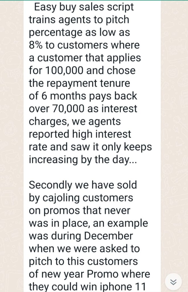 Easybuy sales script trains agents to pitch a percentage as low as 8% to customers whereas a customer that applies for 100,000 and chose the repayment tenure of 6 months pays back over 70,000 as interest charges, which is 70%. We have complained about the high-interest rate as it is also affecting us in getting conversions, but it only keeps increasing by the day.