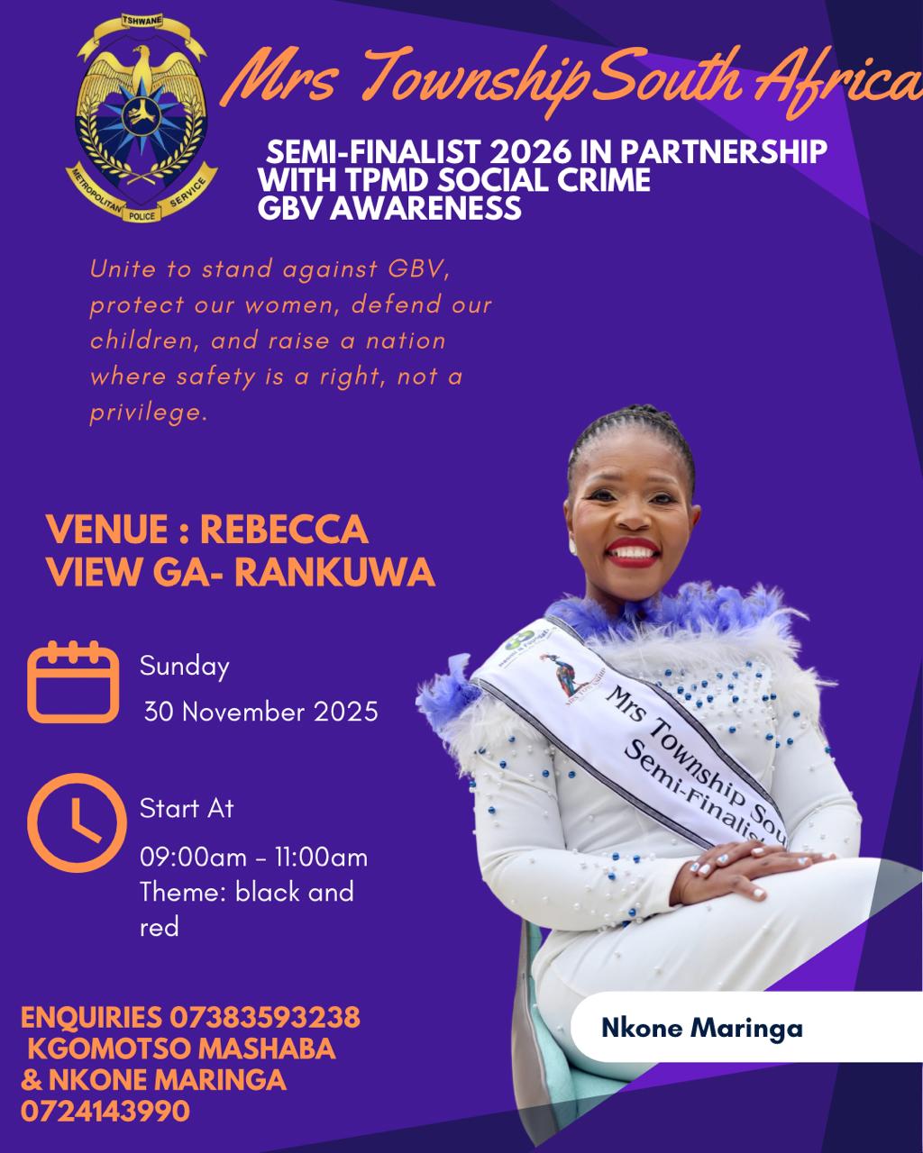 Pretoria, South Africa — The fight against Gender-Based Violence (GBV) is set to receive a major boost as Mrs Township South Africa 2026 semi-finalist, Nkonela Maringa, teams up with the Tshwane Metropolitan Police Department (TMPD) Social Crime Unit for a high-impact community awareness event in Ga-Rankuwa.