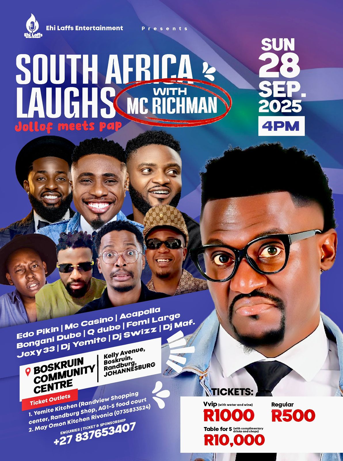 If you are in Cape Town on September 26th or Johannesburg on September 28th, do not miss “Jollof Meets Pap” an unforgettable night where Africa laughs as one, because in the end, as MC Richman always says: “No matter where you come from, when you laugh hard enough, you speak my language.”