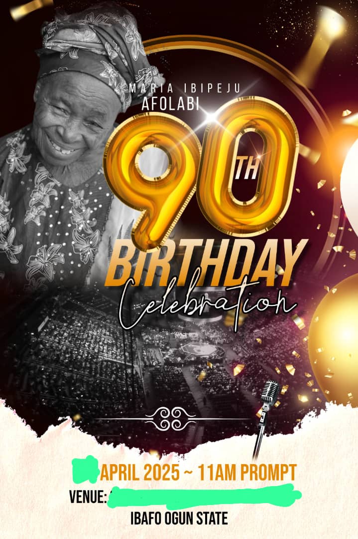 Media guru and highly respected on air personality, Jọlaoluwa Afọlabi famously known as J.J Jabulani is holding an elaborate 90th years birthday bash for his mummy, Mama Maria Ibipeju Afọlabi.