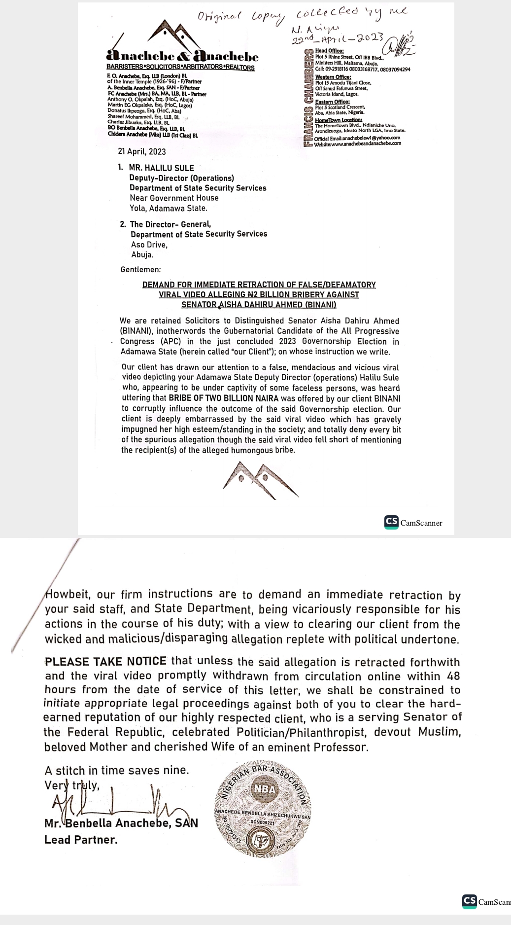 In a letter by her lawyer, Mr. Benbella Anachebe (SAN) to the DG of the Department of State Security Services and Mr. Halilu Sule, Deputy Director (operation), Binani threatened to take legal action against the Department if they failed to retract forthwith and the viral video was promptly withdrawn from circulation within 48 hours.