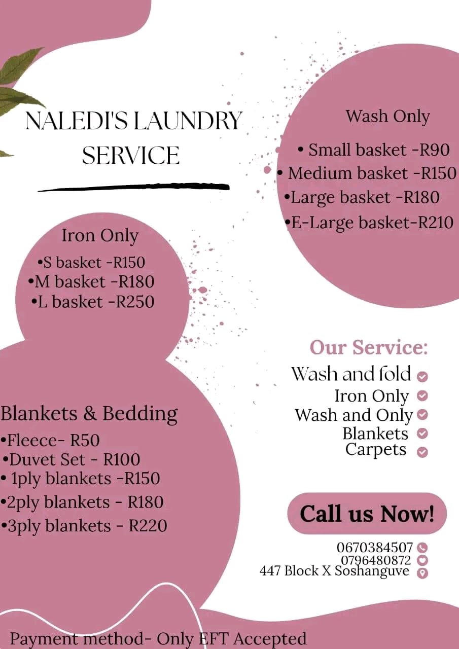 Soshanguve, Gauteng — If you’ve ever wished for a reliable, affordable, and customer-friendly laundry service in your neighborhood, look no further than Naledi’s Laundry Service, located at 447 Block X, Soshanguve.