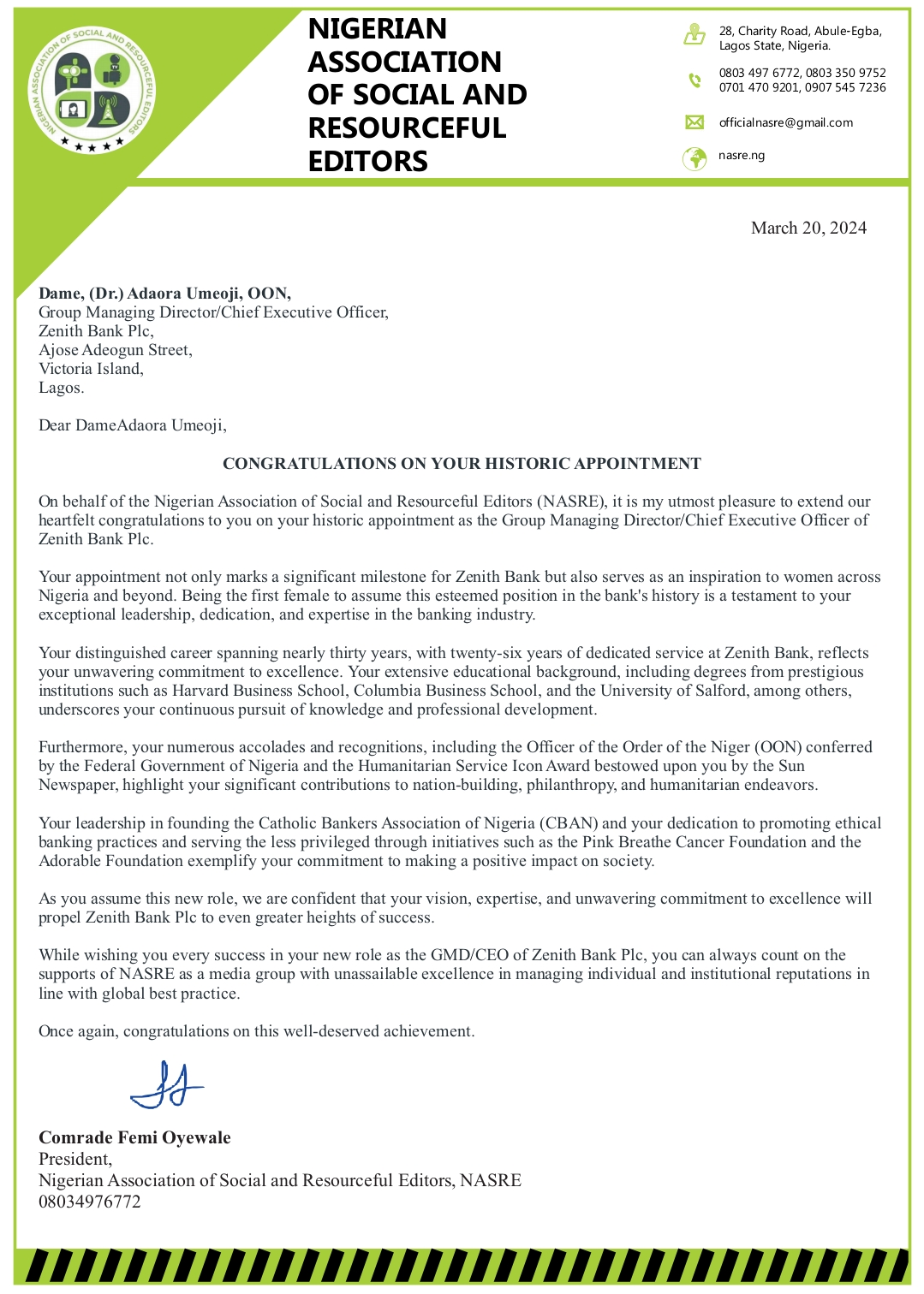 The Nigerian Association of Social and Resourceful Editors, NASRE, congratulates Dame (Dr.) Adaora Umeoji, OON, on her appointment as the Group Managing Director/Chief Executive of Zenith Bank Plc with effect from June 1, 2024.