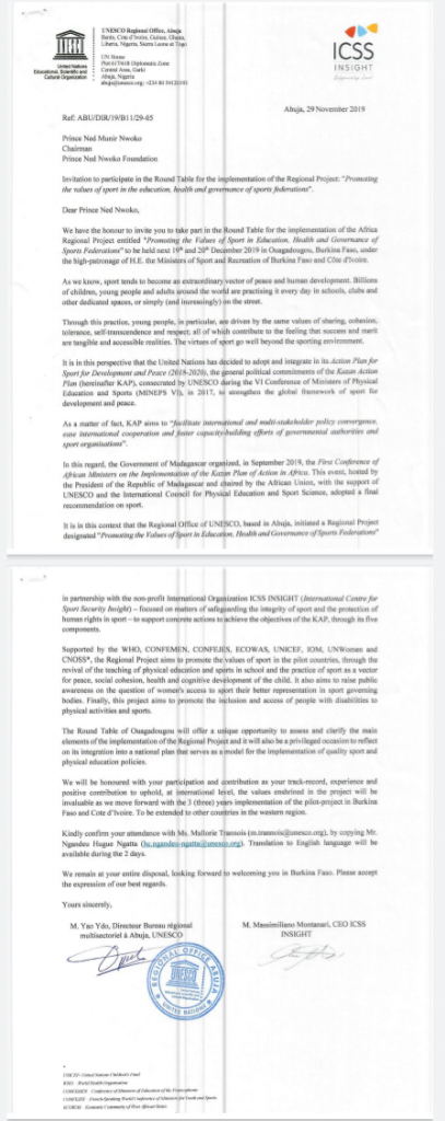 Thus, we reliably gathered that Ned has been picked among the eminent personalities that will speak at UNESCO & ICSS Insight Roundtable,Ouagadougou,Burkina Faso Unser the high patronage of H.E . the Ministers Of Sports and Recreation of Burkina Faso and Cote d’lvoire on the 19th and 20th of December 2019.