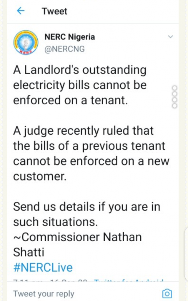 An official statement from the social handle platform of Nigerians Electricity Regulation Commission ( NERC ) has declared it illegal for landlords to enforced outstanding electricity bills of a previous tenant on the new tenant: