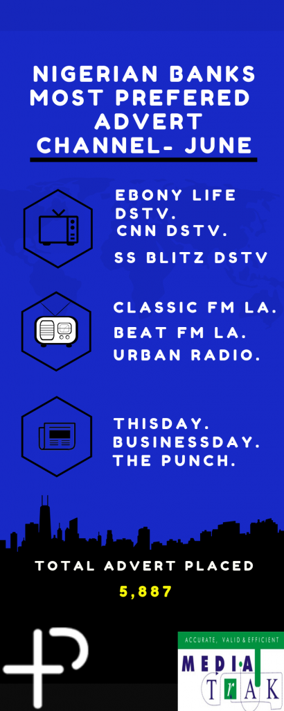 P+ Measurement Services, a media intelligence and audit agency and MediaTrak, undertook the analysis to show, Nigerian Banking Industry Advertisement spend and placement in the month of June 2019.