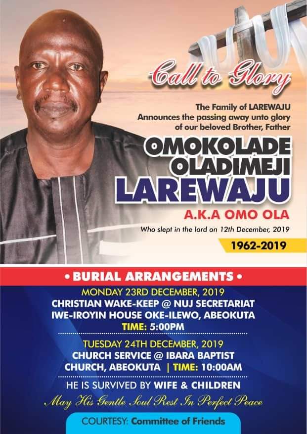 Until his death, Lanrewaju was member of NGIJ Board of Trustees, former news Editor of Vanguard and former Special Assistant on Media to former Deputy Governor of Ogun state, Prince Segun Adesegun.