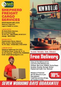 While highlighting other Benefits to be enjoyed by Shepherds Freight and Cargo services customers, the management also remarked that, there will be specific discounts every Friday (TGIF) saying as a Customer you can make payments either with Naira or Pounds sterling depending on your wishes, our charges are reasonable and affordable.