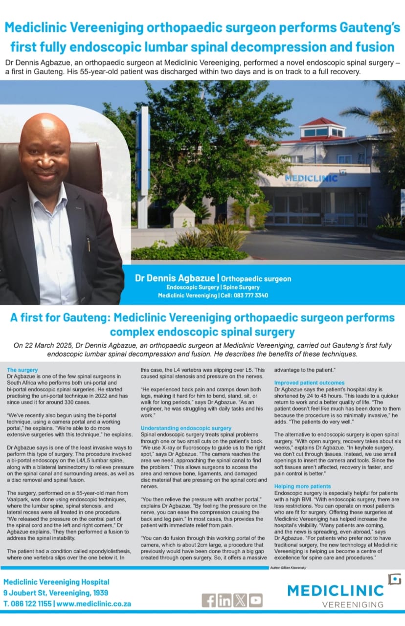 As a result, Mediclinic Vereeniging has seen an influx of patients from across Gauteng, including metropolitan hubs like Johannesburg and Pretoria, seeking treatment under Dr. Agbazue’s expert care. For many, this represents not only hope but a second chance at life free from the chronic pain and disability associated with spinal disorders.
