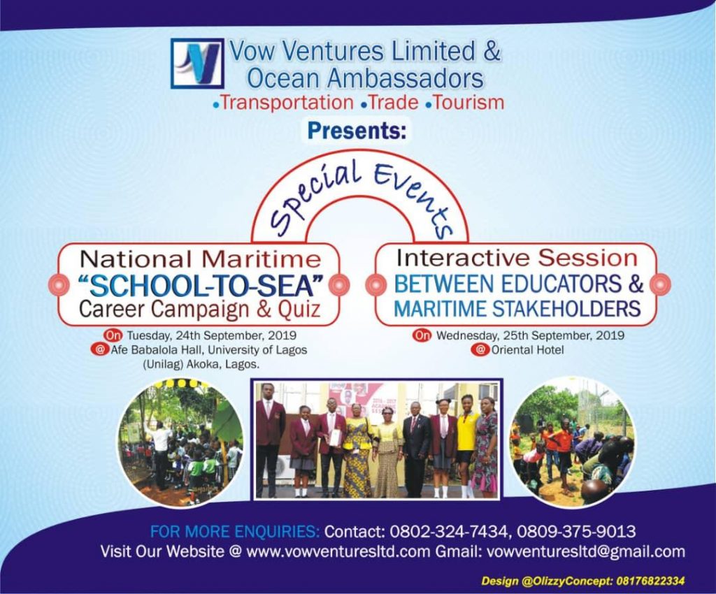 First of its kind Nigerian Maritime E-quiz, a School to Sea Campaign for Secondary Schools Students in Nigeria is set to take place in Lagos on Monday September 24, 2019.