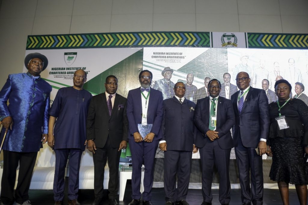 Photo: L-R: HRM Alfred Papapereye Diette Spiff, Professor Osarheimen Osunbor, Professor, Faculty of Law, University of Lagos and former Deputy Governor, Delta State, Senator Opeyemi Bamidele – Chairman Senate Committee on Judiciary Human Rights and Legal Matters, Moyo Onigbanjo, SAN – Honourable Attorney General and Commissioner of Justice, Lagos State, Dr Okwesilieze Nwodo, CON, Professor Fabian Ajogwu, SAN – Partner Kenna Partners, Dr. Olisa Agbakoba, SAN – Senior Partner, Olisa Agbakoba & Associates, Chinyere Onuorah – Deputy Registrar, Nigerian Institute of Chartered Arbitrators.