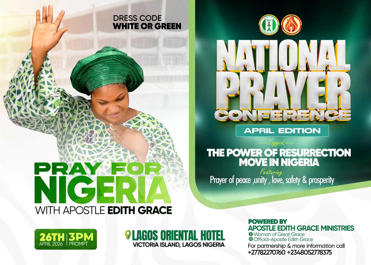 The upcoming *National Prayer Conference*, organized by Apostle Edith Grace Ministries, is set to take place on *26th April 2026* at *3:00 PM* at the Lagos Oriental Hotel. The event, themed _“Power of Resurrection Move in Nigeria,”_ will unite believers in a nationwide spiritual gathering focused on prayer, revival, and divine empowerment.