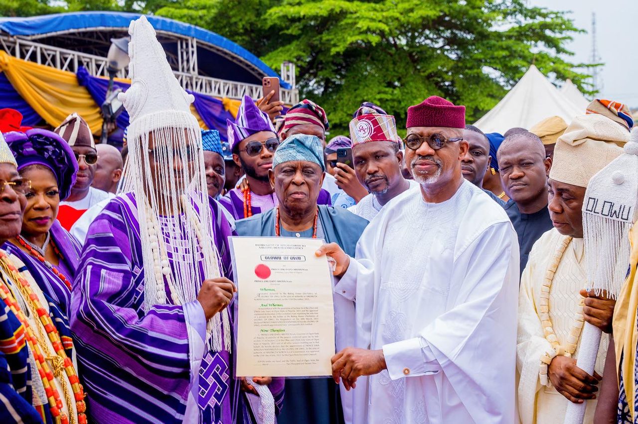 Ogun State governor, Dapo Abiodun, on Saturday, presented the instrument of office to the 14th Olowu of Owu, Oba (Prof.) Saka Matemilola, with a charge to see his installation as a call to service towards the development of Owu Kingdom and the state in general