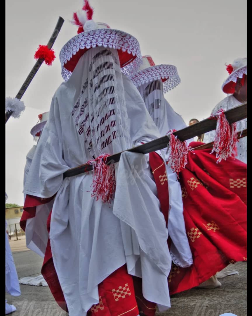 At the heart of the festival are the Eyo masquerades, dressed in flowing white robes, wide-brimmed hats (Aga Akete) and carrying the symbolic staff known as the Opambata. Beneath the robe, Eyos wear the Aropale, tied at the waist, while the face is covered with a white veil perforated to allow vision.