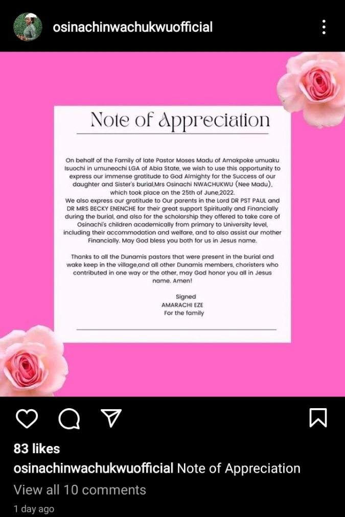 “On behalf of the Family of late Pastor Moses Madu of Amakpoke umuaku Isuochi in umuneochi LGA of Abia State, we wish to use this opportunity to express our immense gratitude to God Almighty for the success of our daughter and Sister’s burial Mrs Osinachi NWACHUKWU (Nee Madu)which took place on the 25th of June, 2022.