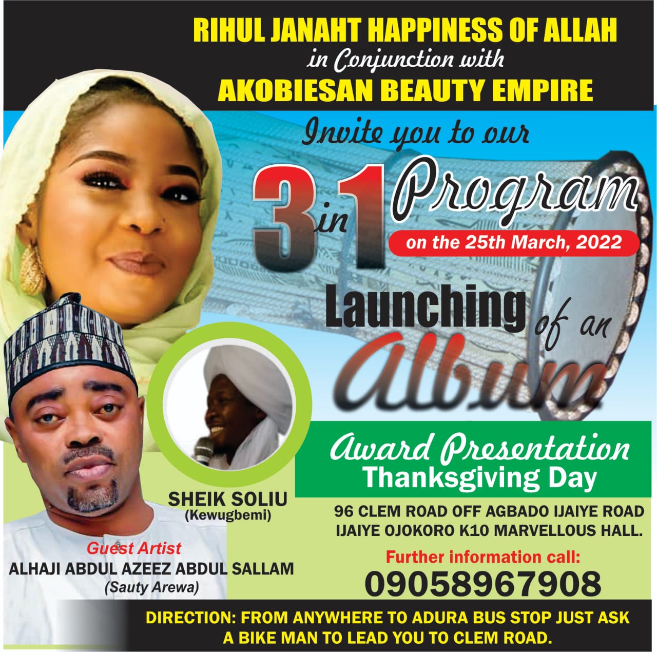 Her music composition is superb coupled with her sonorous voice, and she has produced more than six albums, she has also featured with Alhaji Abdulsalam Azeez Abiodun popularly known as Saoty Arewa who will be the guest artiste on the album launching day and other several Islamic artistes on band stand. The event will be hosted by Ifankalenyah